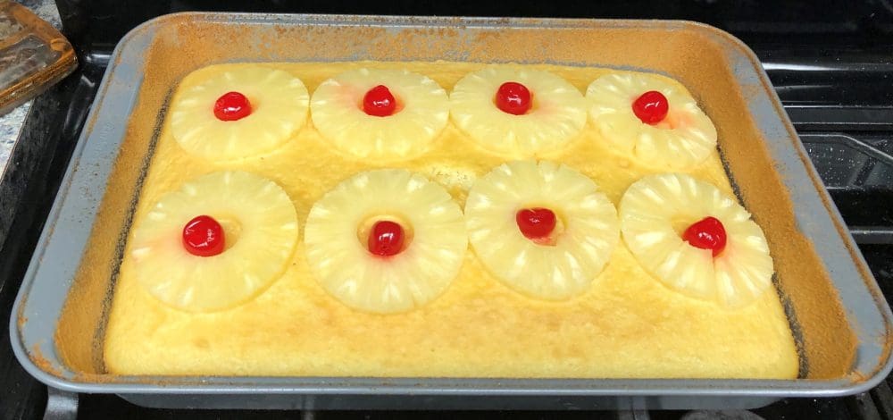 He ate some soon after. He said it didn’t taste like pineapple upside-down cake. Imagine that! I told him that the way I usually did it was to put the sliced pineapple in the bottom of the pan over a mixture of brown sugar and melted butter, cherries in each center, and then pour the mixed cake mix on top before baking. I didn’t push it because what I ‘usually’ did had turned out a dismal failure this time.
