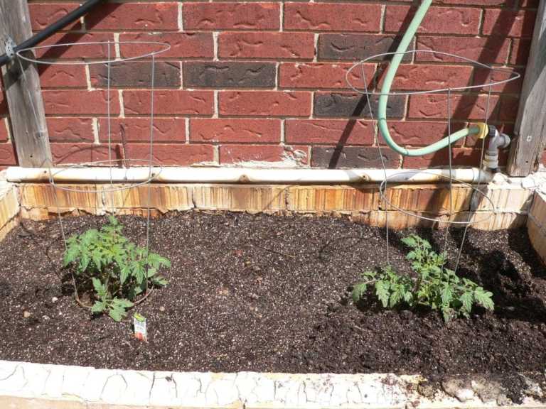 With all the rain we’ve had, the tomatoes got really big and bushy quickly. They do have some bright yellow blossoms, and if you look carefully, you can see a tiny green tomato. At this point, I’m just going to prop them up the best way I can and hope for the best.