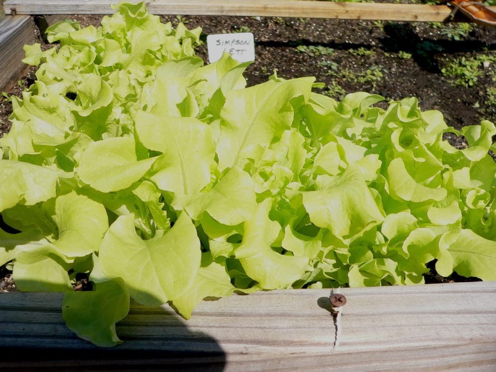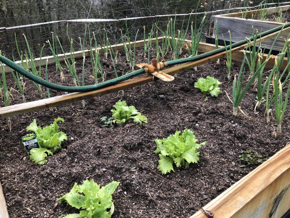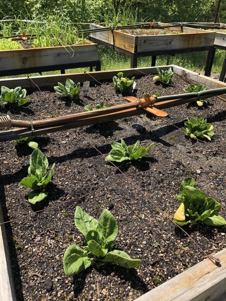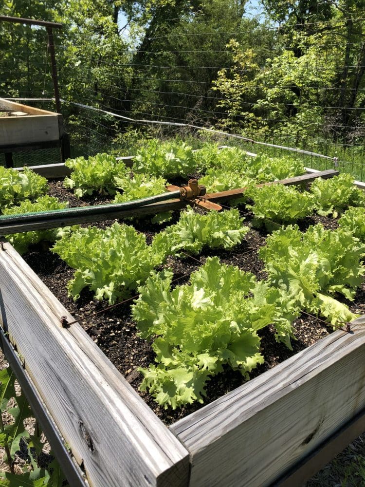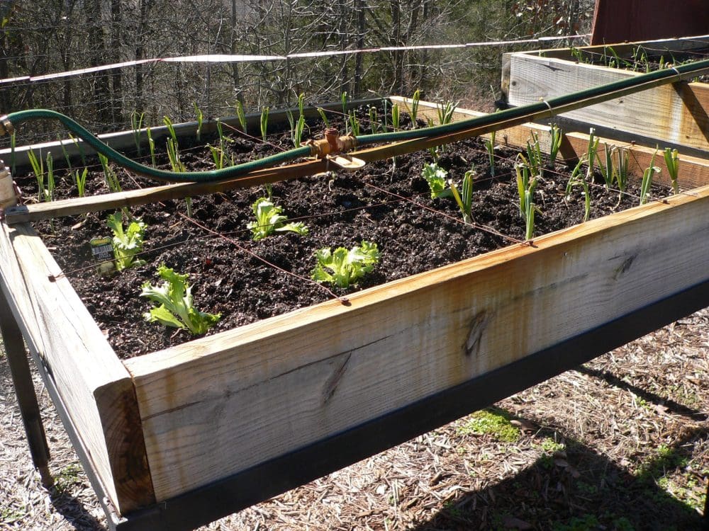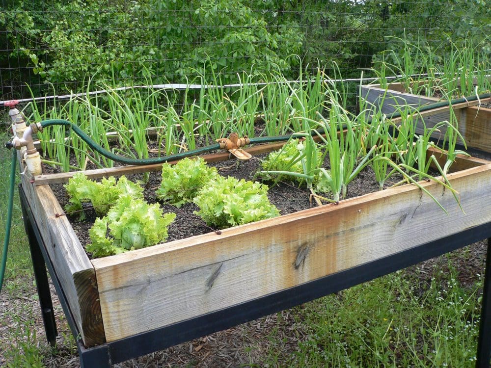This is a picture of my spring garden last year in the raised bed planters my husband and I made. There are SIX 4’x4′ planters held up by angle iron ‘tables’ about my chest height. They allow me to weed, plant, and harvest without having to get up and down a million times or get down on hands and knees.