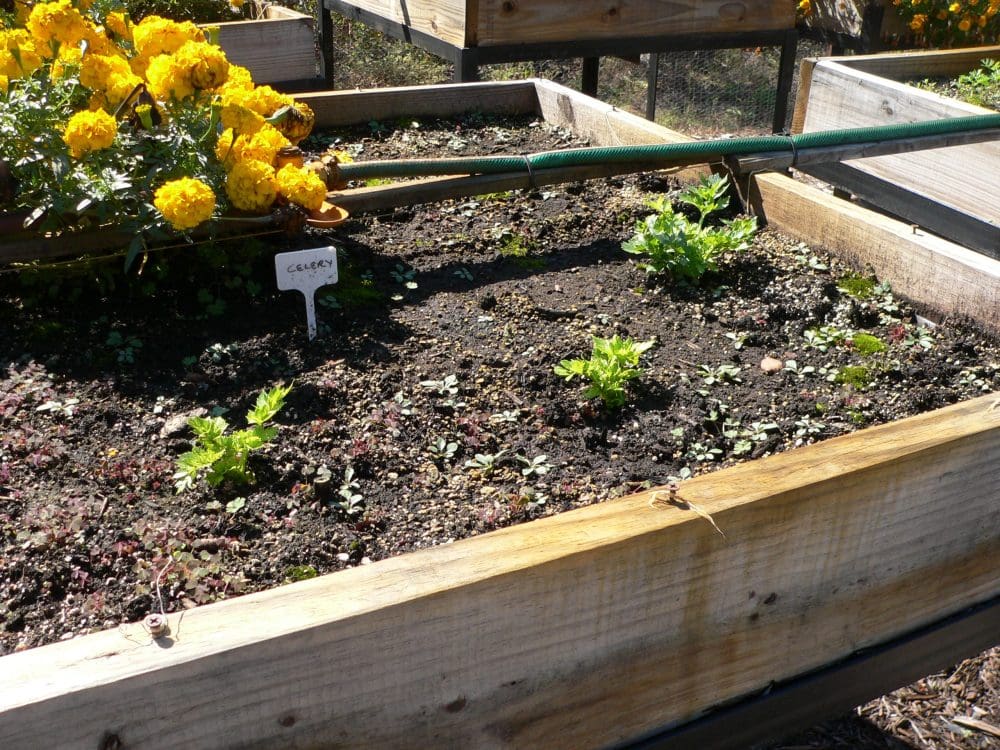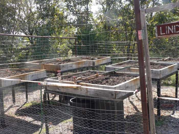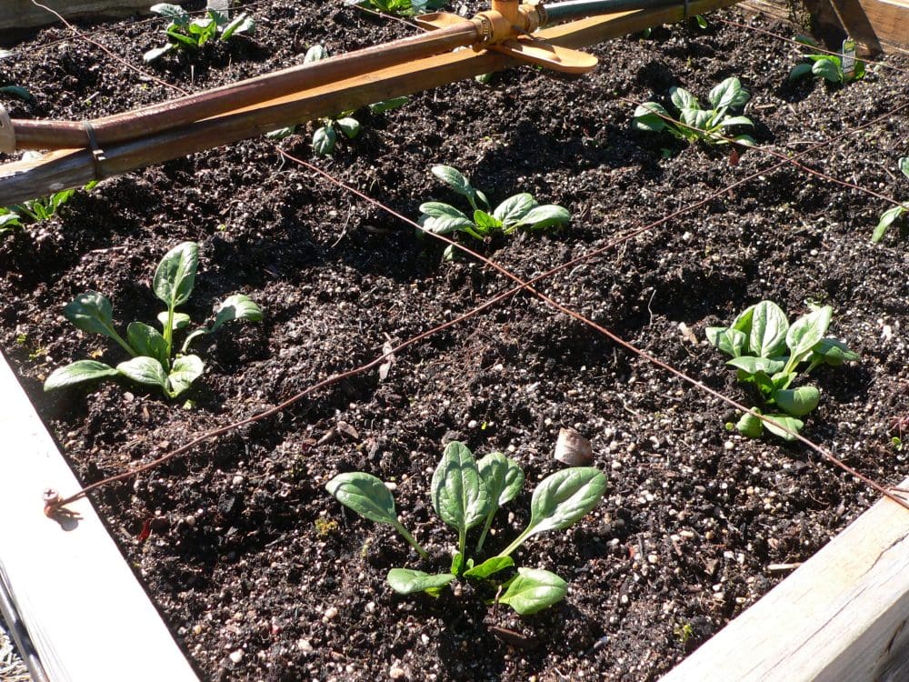 The planters are filled with Mel’s Mix (combination of peat moss, vermiculite and as many different composts as you can find.) We mix the ingredients together in a portable cement mixer and then bring the mix into the planters to top off. Then we stretch string across in two directions to make the ‘squares’ for planting.