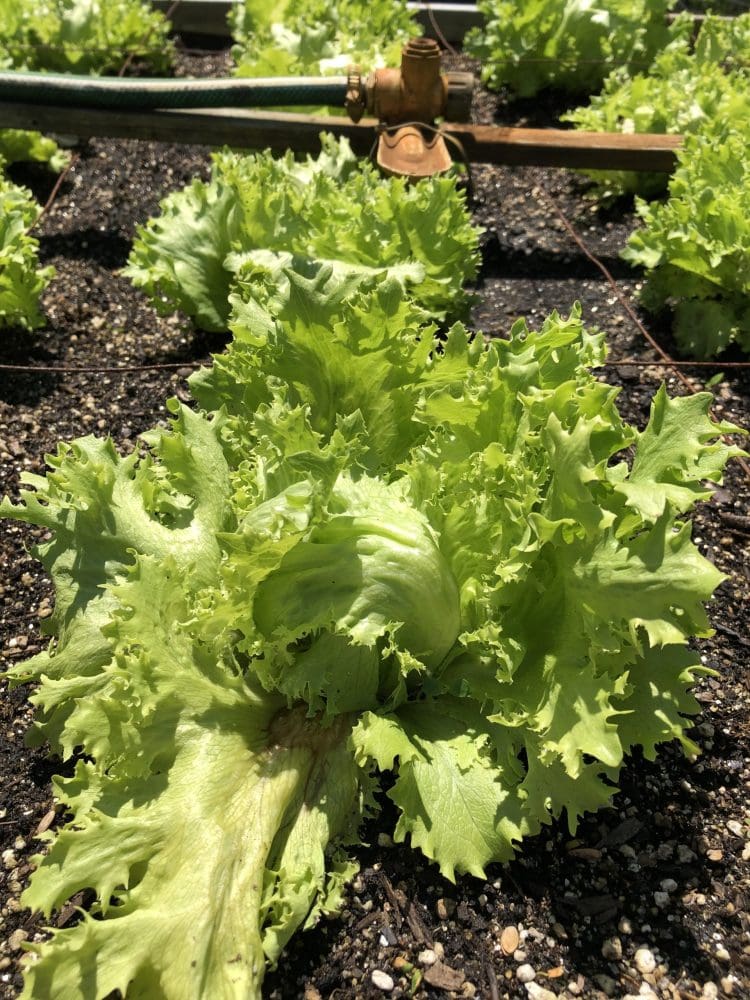 This picture gives you another view of the planters. We also used some netting at the end of July and through August when the sun tries to boil plants right in the ground. You can see the hoses and the sprinklers we use to water the plants automatically. They are attached to an outdoor faucet on a timer.