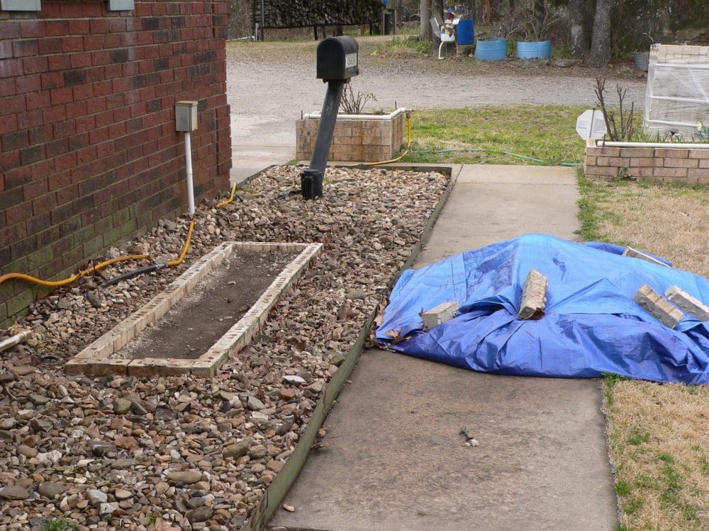 We spent a lot of time and effort knocking the rest of the bricks down and hauling them behind our well house. We got down to the last round of bricks, but even with a sledge hammer, couldn’t budge them. We cleaned up the area as much as possible, shoveling the potting soil onto a tarp and then wrapping the soil up, hoping to save it.