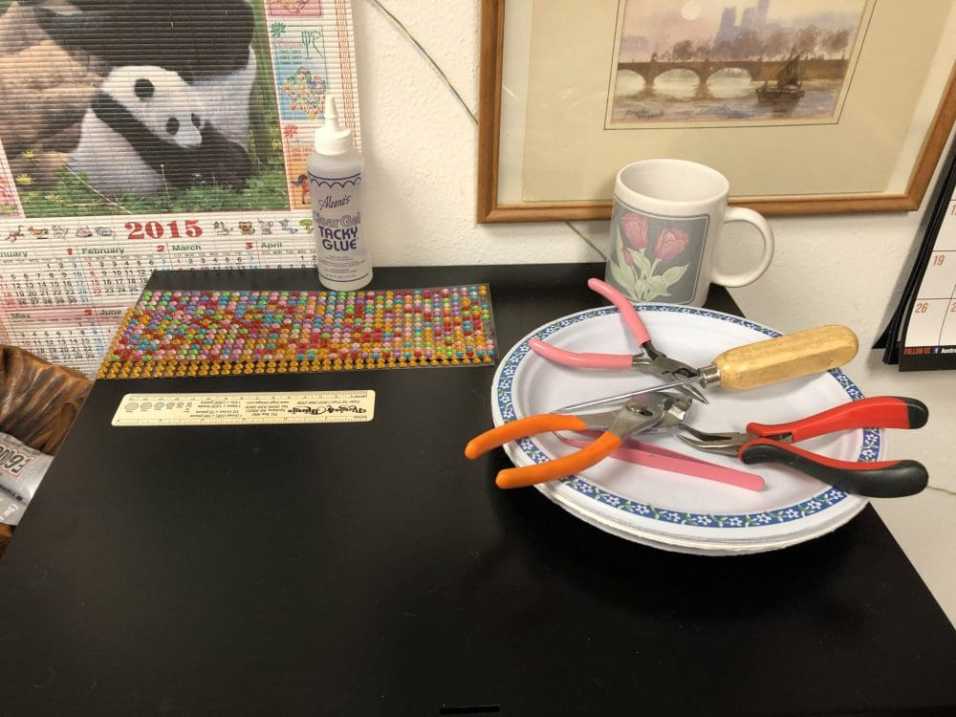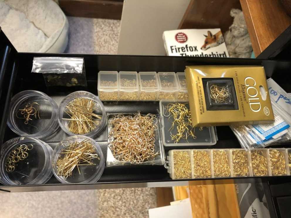 This is my jewelry findings area now. You can see my wooden ‘thingie’ on the left and the tabletop filing cabinet on the right.