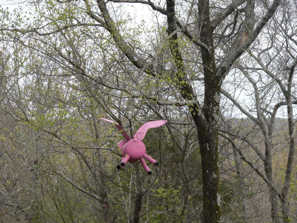 This is our flying pig. He hangs from a sturdy line from a tree in the driveway. He turns and twists in the breeze. He’ll probably have to fall down for me to refurb him. He’s too hard to get up there!