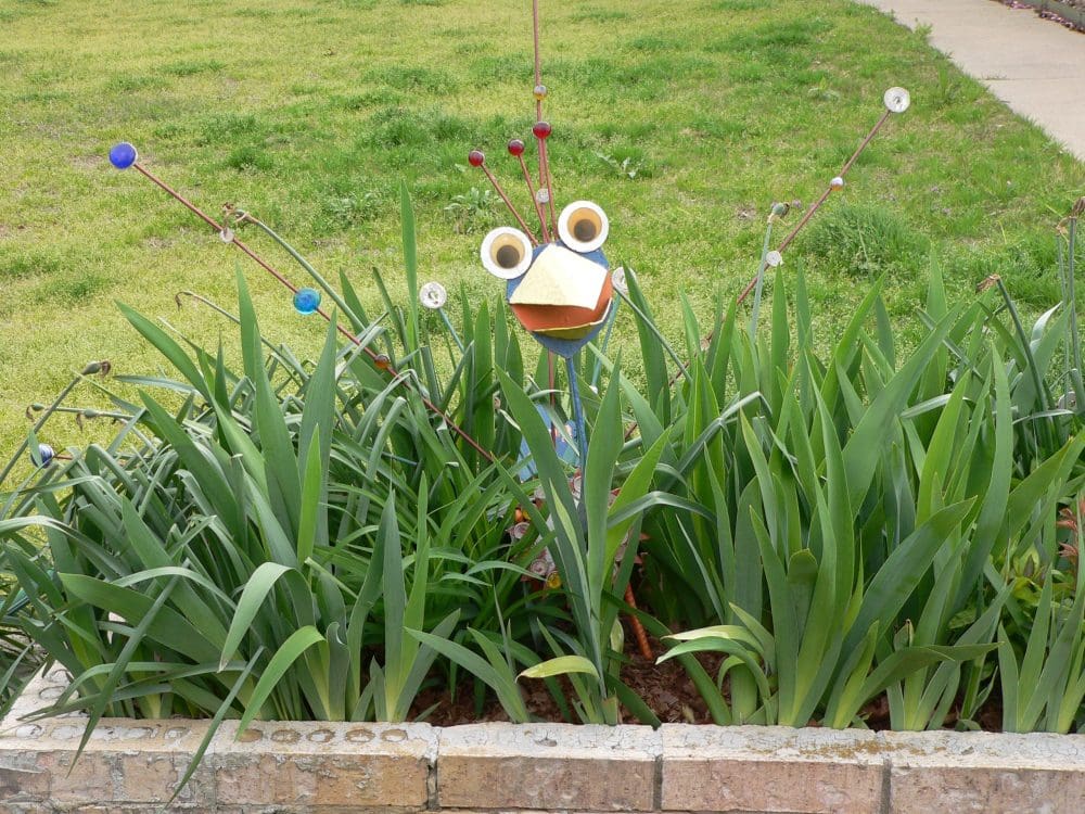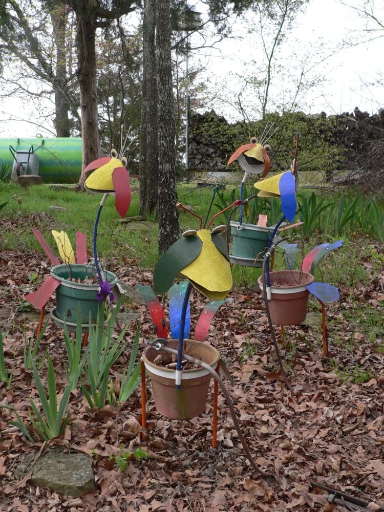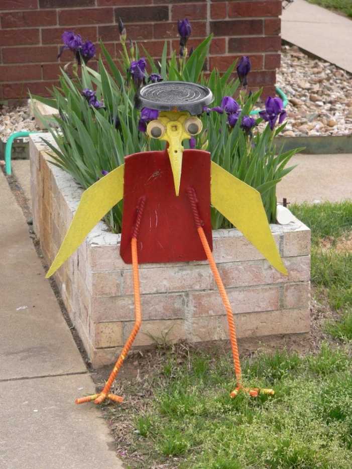 I always walk around the yard while taking the doggies out. Lately I’ve been deciding which of our yard art pieces need refurbishing, like the gloves, bow tie, and bandana on the two robots in the previous post. I thought you might enjoy seeing a few of the pieces I looked at today –
