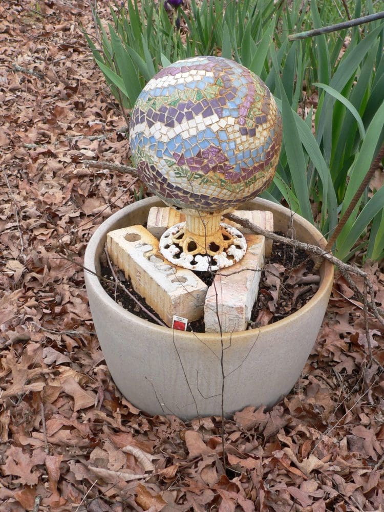 This is the gazing ball I covered with a mosaic design a couple of years ago. It needs a good scrubbing with a brush, but it looks okay, otherwise.