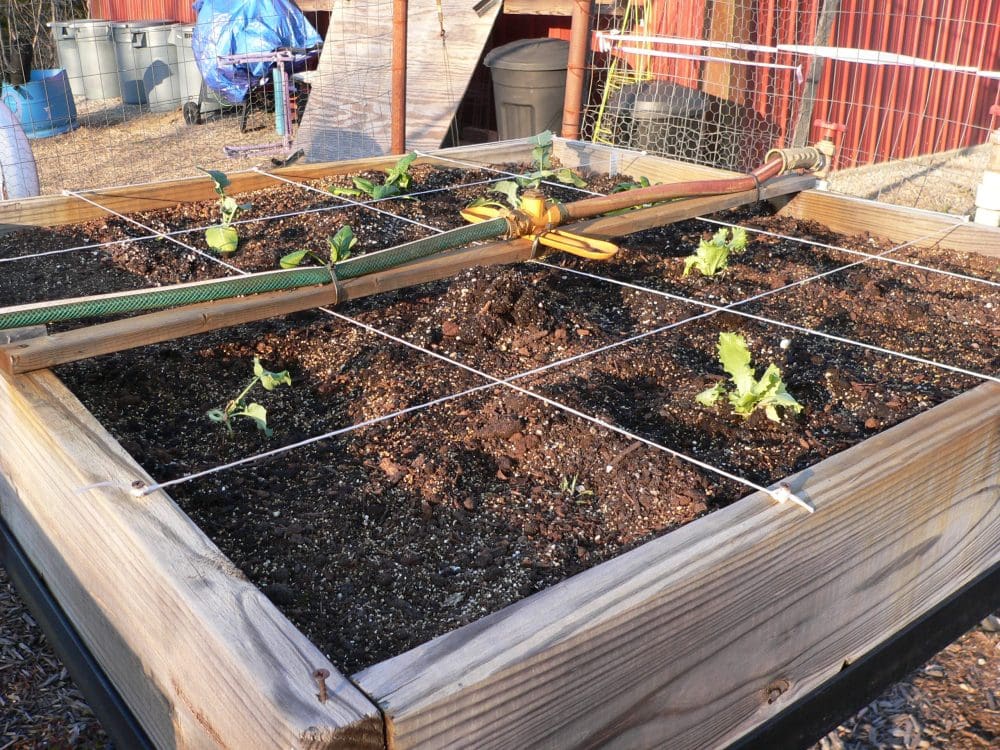 Each box has a sprinkler in the center that are connected by pieces of hose. These are all tied to a main hose that connects to a rural type outside faucet. We put a timer on it so that the garden is irrigated each morning.