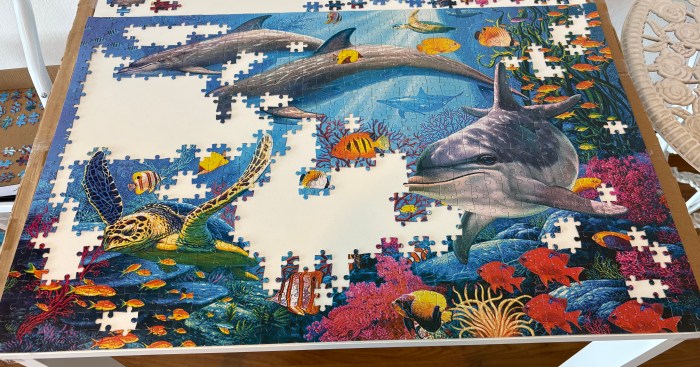 I’m making some progress on my puzzle. Brian is teasing me about (1) taking a long time to finish it, (2) NOT TAKING LONG ENOUGH to finish it – ‘griping’ about how much money it costs to get the finished puzzle picture printed on glass like the other two I have, and then (3) already having bought me the turtle puzzle I wanted, but couldn’t get, a while back.