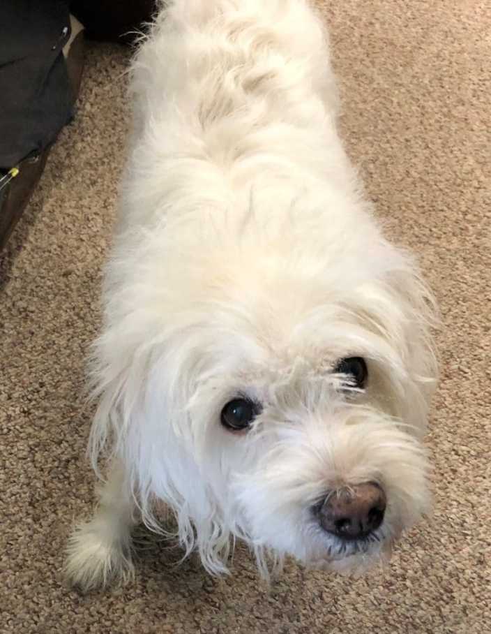 I managed to use the Furminator on her again first thing this morning. Molly seems to be shedding a full ‘dog’s worth’ of hair every day! I worked on her as long as she would allow (collecting a truly impressive amount of long white hair in the trash can) and then used the scissors to clip the hair out of her eyes some. She has her new expensive flea and tick collar on now.