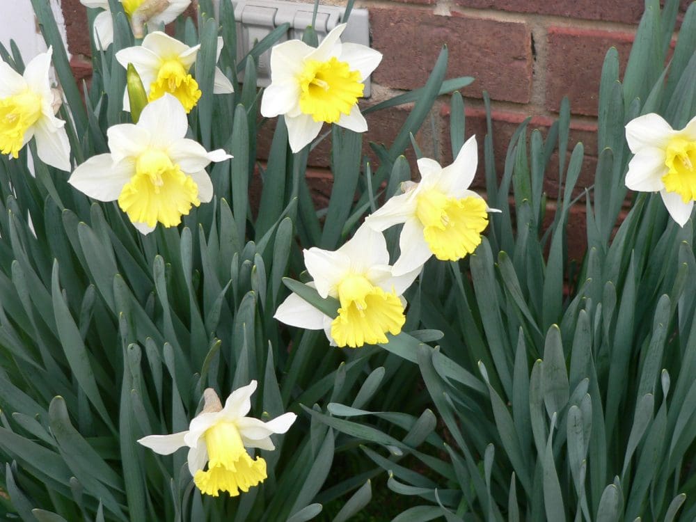 Big happy daffodils in several different shades of yellow and styles, all living together. Long stalks heavy greenery, bringing up my spirits.
