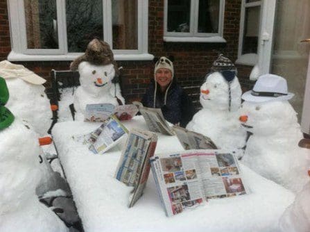 When we were dating, my husband decided to build a snow person in my parent’s front yard in Tulsa. Imagine their faces when they went out to get the newspaper the next morning to find an extremely FEMININE snow person greeting all comers! A couple of parts were quickly removed before they went back in. :0)