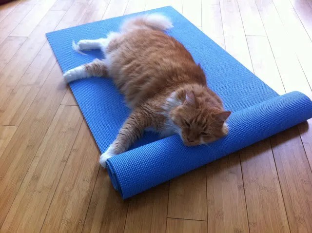 This looks very much like my cat, Abby, when I do my yoga practice. (Today is DAY 64) She either tries to curl up at my head, upset with me when I put my arms over my head, or sleeps on my feet, making it almost impossible to move them. Yesterday, she curled up beside me and kept batting at me with her paw.