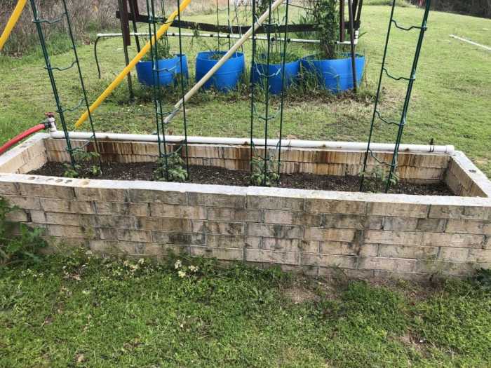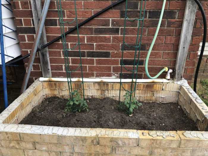 We have two tomato planters. We converted two brick planters on the opposite side of the house from the garden to square-foot-garden planters, though I used bags of potting soil to top them off this year. The one in the picture above we call the “niche” planter, since it’s tucked in beside the back porch and is shielded by the house.