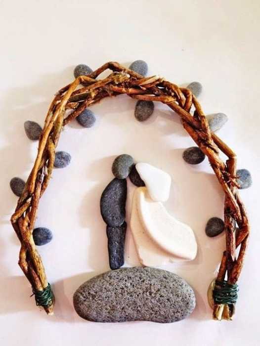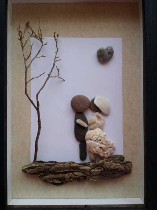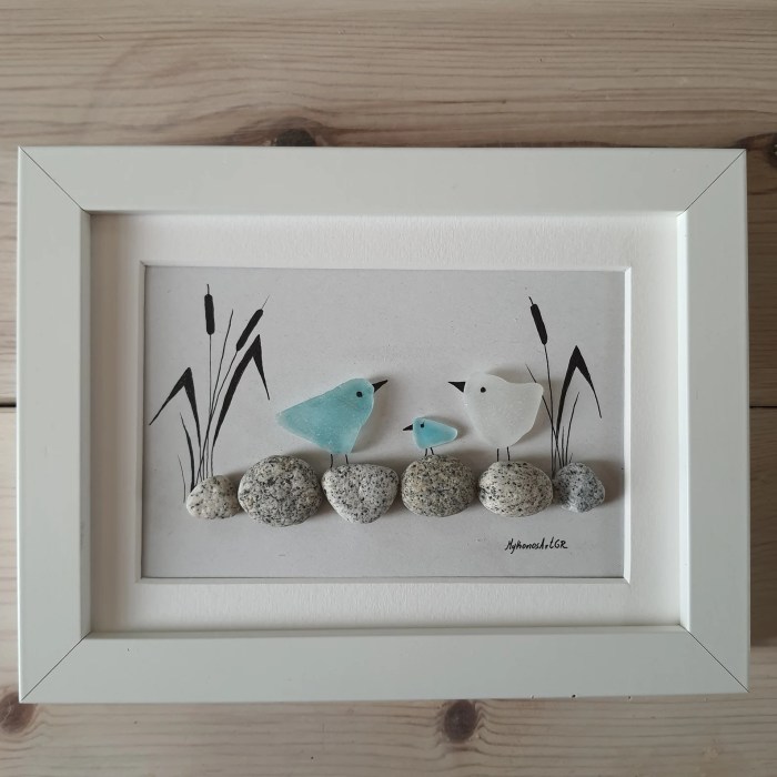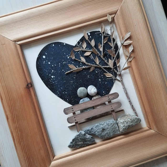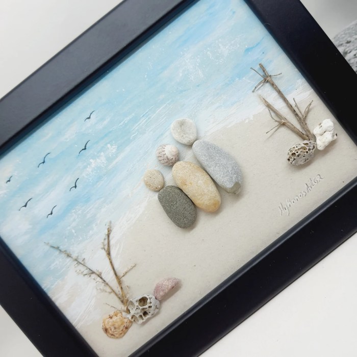 I love the way she mixes media in these. She creates a whole story to go with whatever she has made with the stones or pebbles. She paints the background, and maybe even parts of the pebbles – whatever helps create the mood or message. She also uses twine, branches, glass, wood as accents. I think she is a master of pebble art. I just love what she does.