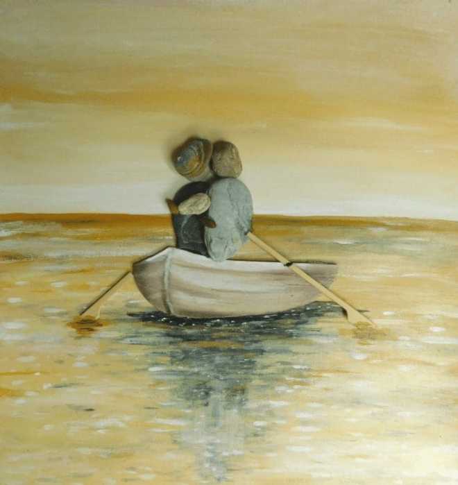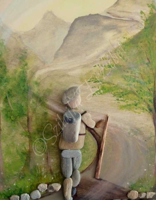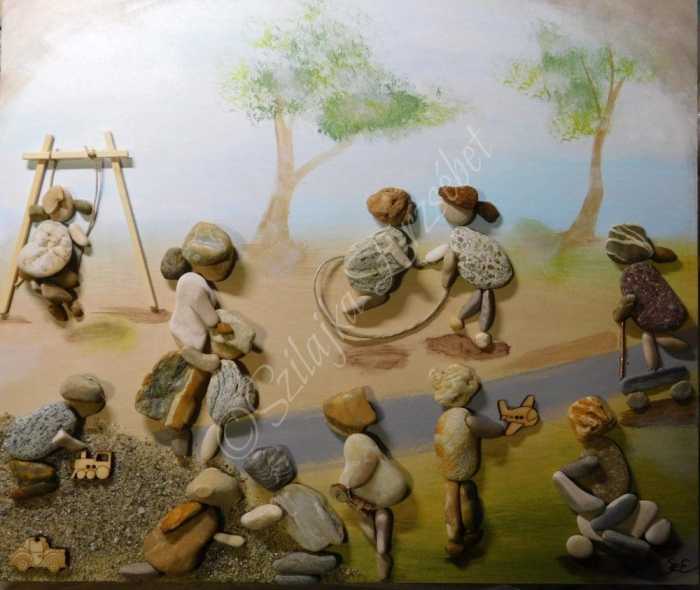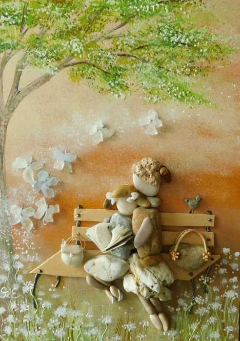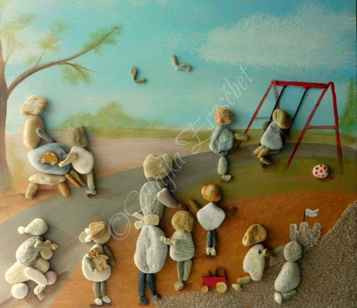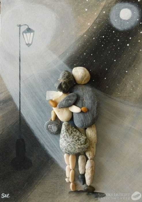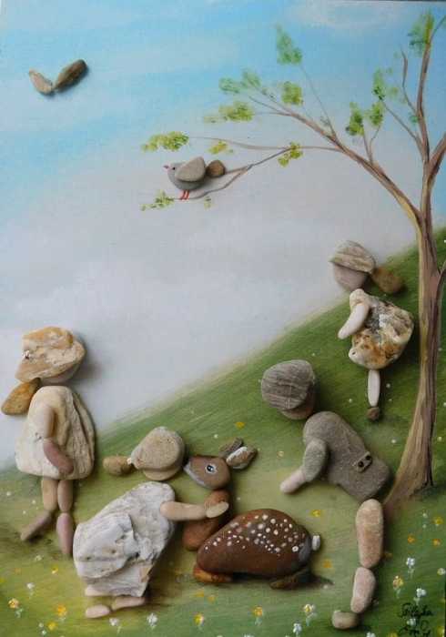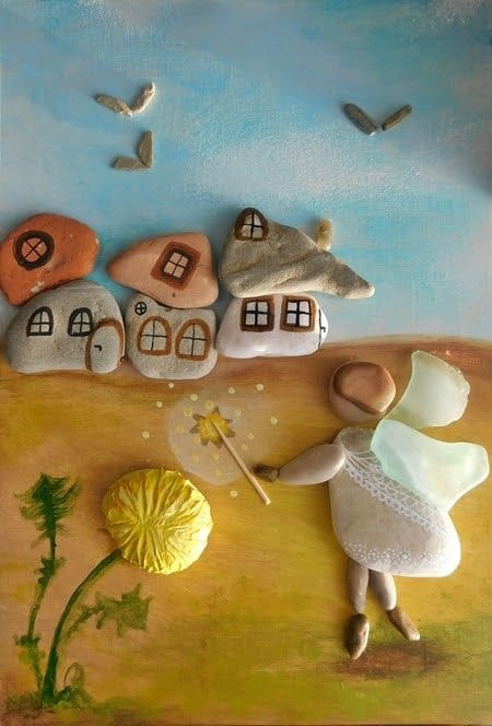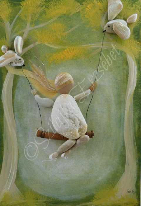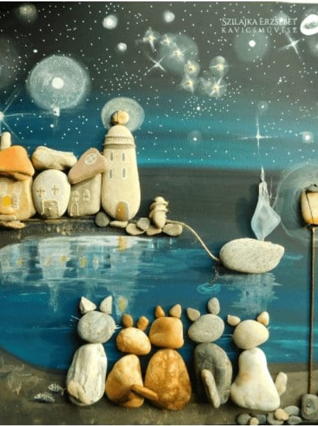 More pebble art from Erzsebet Szilajka – an artist I think does stunning work, combining the pebble art with painting beautiful backgrounds, telling a whole story, rather than ‘simply’ making a nice design.