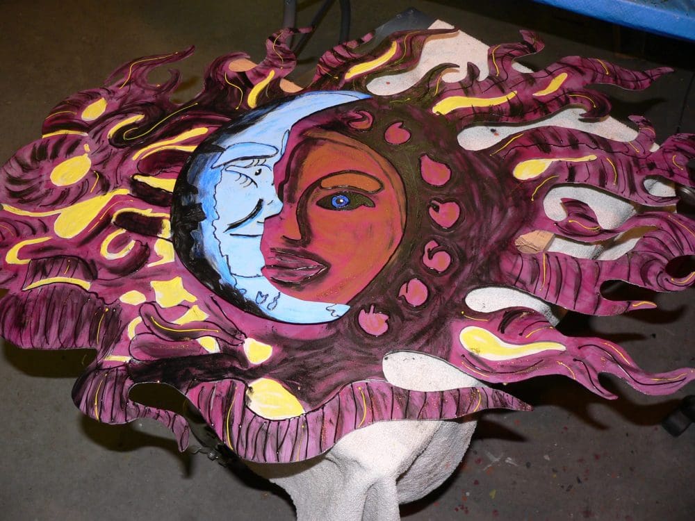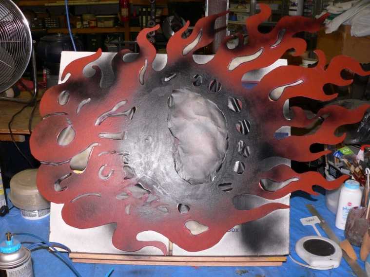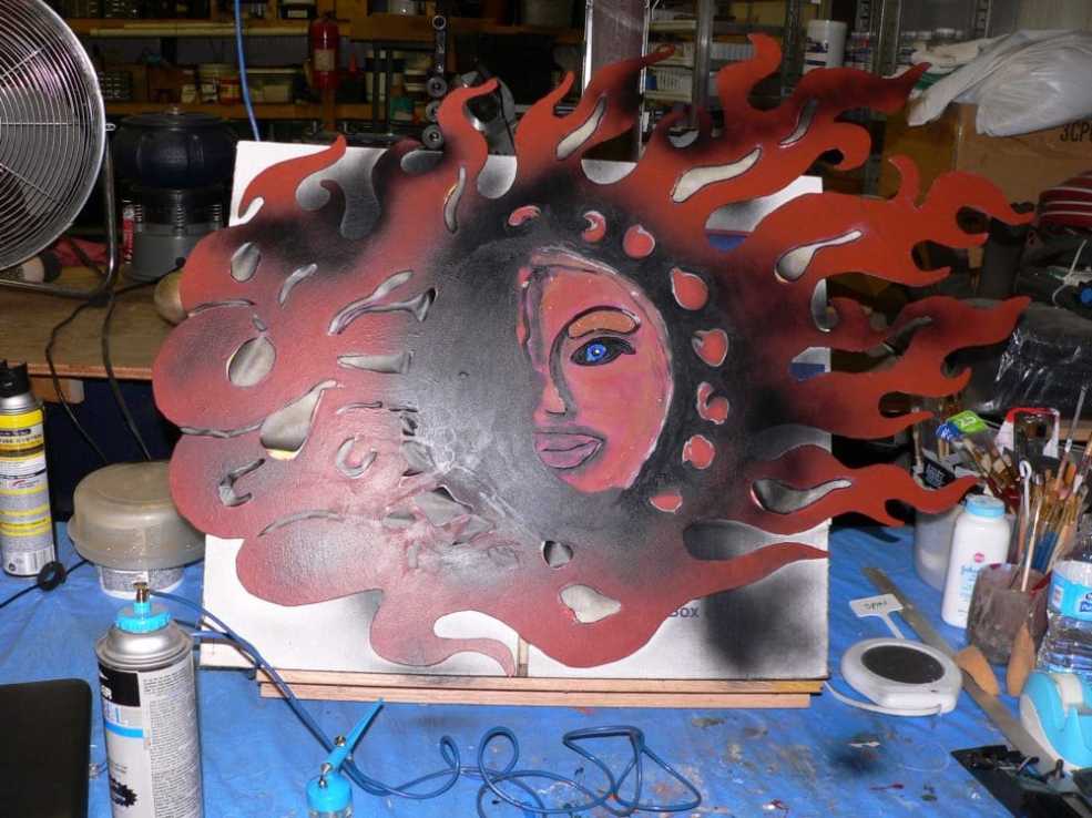 We went out to the shop to experiment with the air brush in the redoing of our sun/moon metal wall hanging. I felt really intimidated, since I’ve never used an air brush before. This made me determined to at least TRY it. I used paint thinner to make sure that the air brush and tube in the bottle were clean and ready to use. The other end of the tube is attached to a compressed air bottle. We then switched the bottle to a black paint for the shading we were trying to do. I practiced on a cardboard box until I was achieving a reasonably uniform, light spray. I had used tracing paper to mask some areas I didn’t want any shading on. I was able to achieve a darker shading around the sun face and along one side of the moon, with lighter shading on the flames of the sun. My husband and I looked at the picture on the computer together, deciding where the next shading should be.