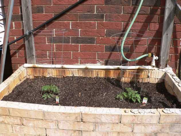 This is a second brick planter that is about 4 feet wide that sits in a nook created by the back of our house and the screened back porch. The tomatoes are more protected here, and usually survive better than the ones that are more susceptible to the wind.