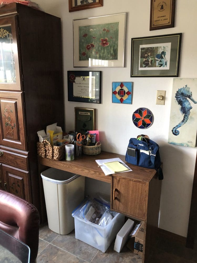 We call this the “Go Out Table” because we stage things we need to take with us for errands, etc. It also houses my husband’s diabetic supplies. Under it is a bin with stuff going one way or the other from the booth in town I rent with my friend.
