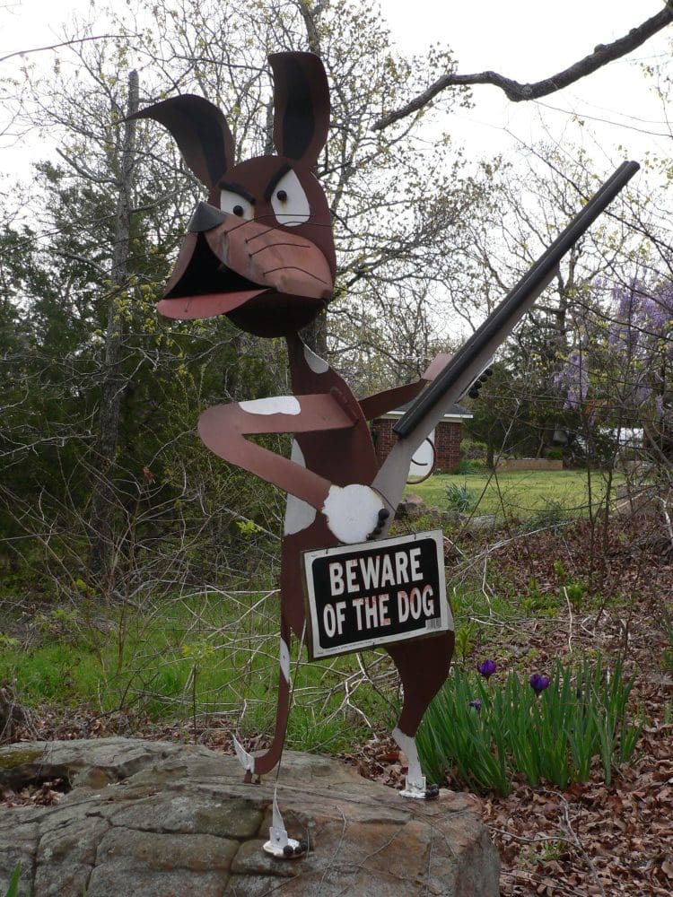 Our “Welcome Robot” doffed his hat at visitors, while giving the house number. We used a larger propane tank for him. He weighed about 200 lbs. A huge gust of wind would blow him over, or down the hill to the side of the driveway. We ended up putting a large chain around his neck, then attaching one end to a tree down the driveway farther and the other to the pole behind him – the stand for the owl and a driveway bar we put down when we were gone for any length of time. The wind would still make him LEAN, but we could pull him up and put something under a foot or two to stabilize him.