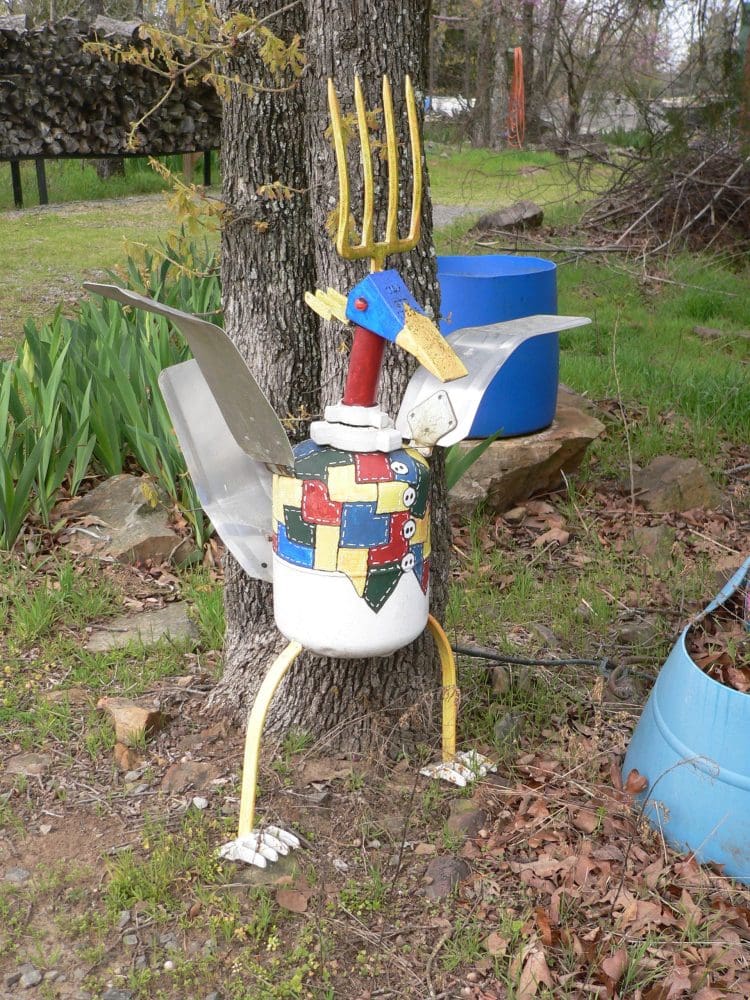 Our “Patchwork Popadoo” Bird is shown here in our shop at my painting table before we put him out in the yard. He had fan parts as wings, various tool parts as his head, beak, and head ‘feathers’. He had bended metal for his legs and feet.