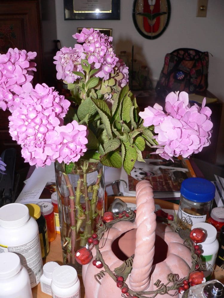 As I was cleaning out and mulching flower beds today, I gathered some of our last flowers of the season so that we could enjoy them inside. I thought you might enjoy seeing them, too. We have pink hydrangeas,