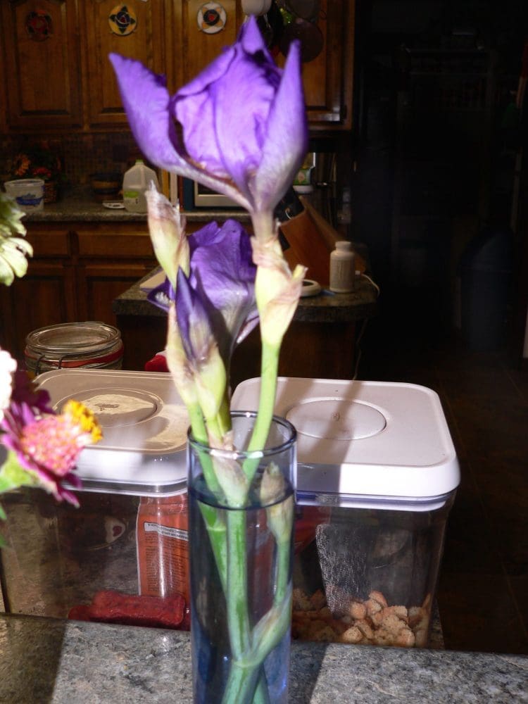 When I was working in the yard a couple of days ago, trying to clean out our flower planters before the coming bad weather, I found these iris! We have several deep purple ‘twice-blooming’ iris that we treasure. I don’t remember seeing any others around the yard this year, but these were blooming behind the well house. They bloom in the spring, and then again in the fall. I couldn’t bear the thought of them freezing, so I cut them and brought them in the house so we could enjoy them as long as possible.