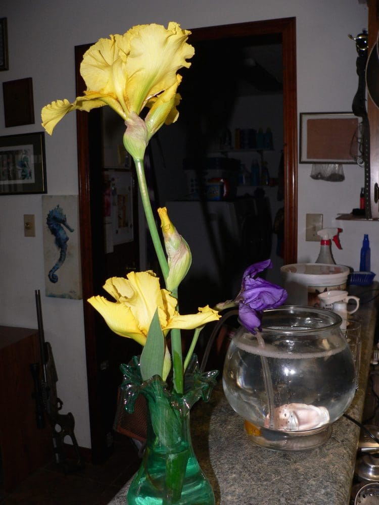 These are two yellow iris from the planter I talked about. They have a really nice, deep yellow color. We also brought in one of the mauve ones.